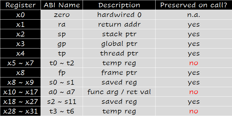 x5-x7以及x28-x31是 temp reg,如果需要的话 caller 保存;也就是说,不保证在经过过程调用之后这些寄存器的值不变。